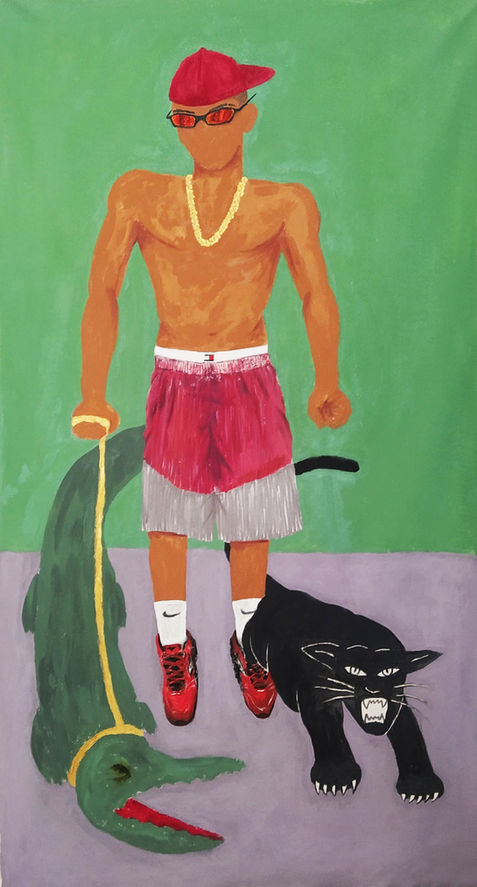 Maycon, tinta de tecido e acrílica sobre tela, 125 x 81 cm, 2021